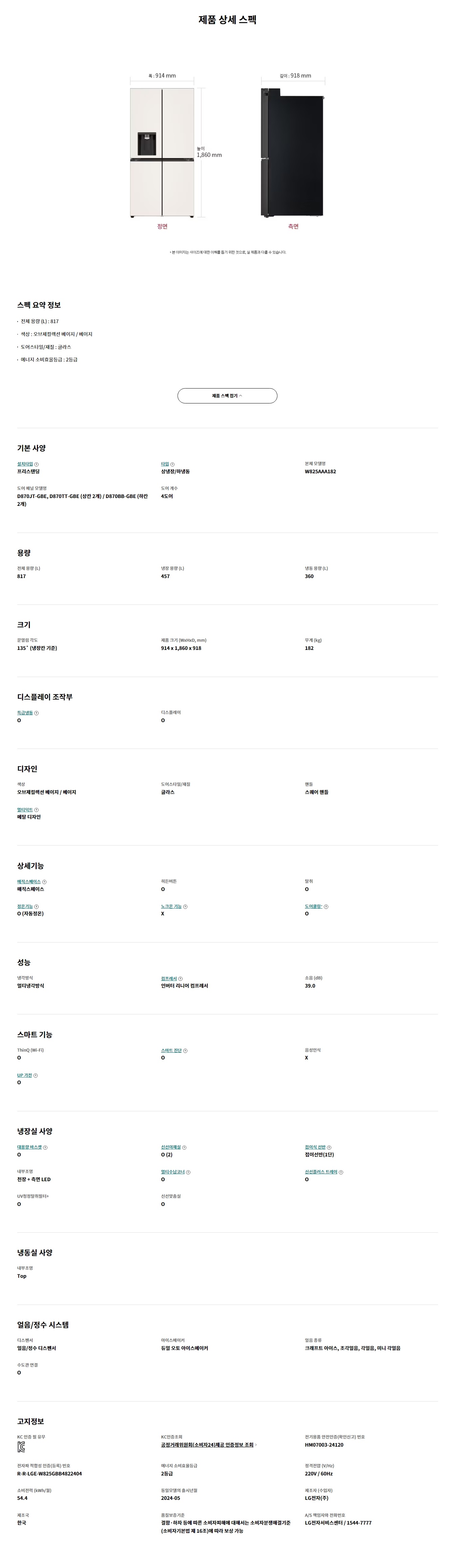 LG 디오스 오브제컬렉션 STEM 얼음정수 냉장고 (매직스페이스) 817L 2등급 W825GBB182S