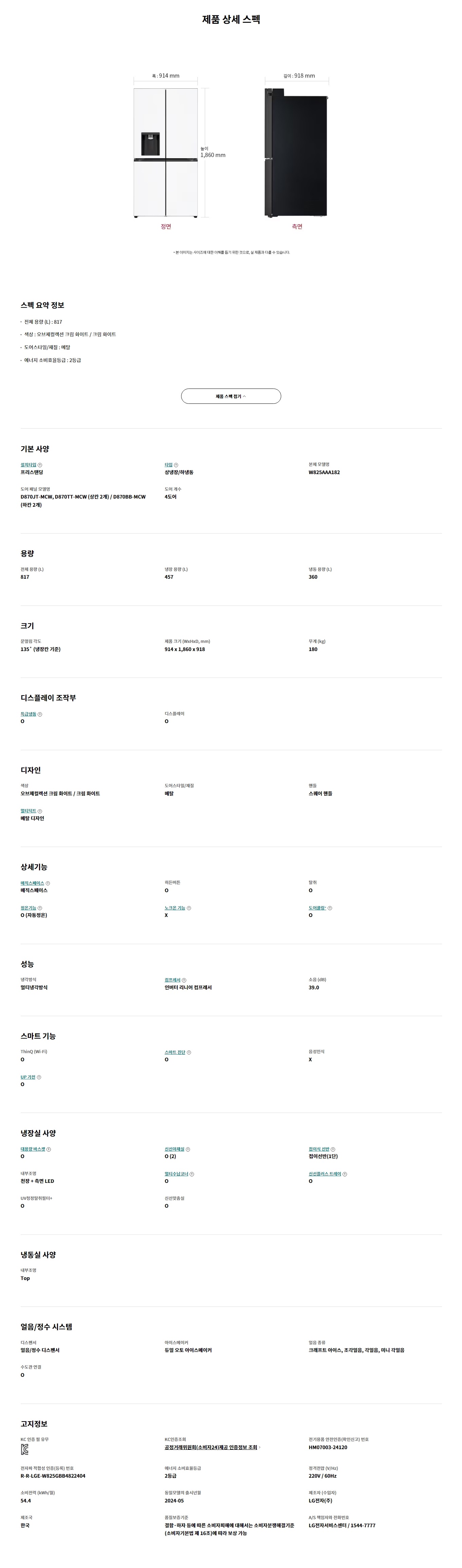 LG 디오스 오브제컬렉션 STEM 얼음정수 냉장고 (매직스페이스) 817L 2등급 W825MHH182S
