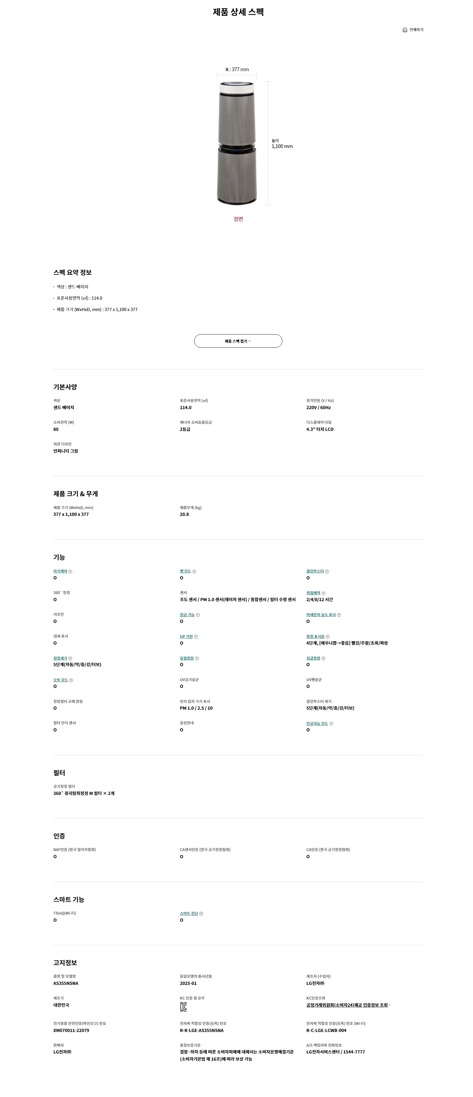 제품 크기 (WxHxD, mm) : 377 x 1,100 x 377
