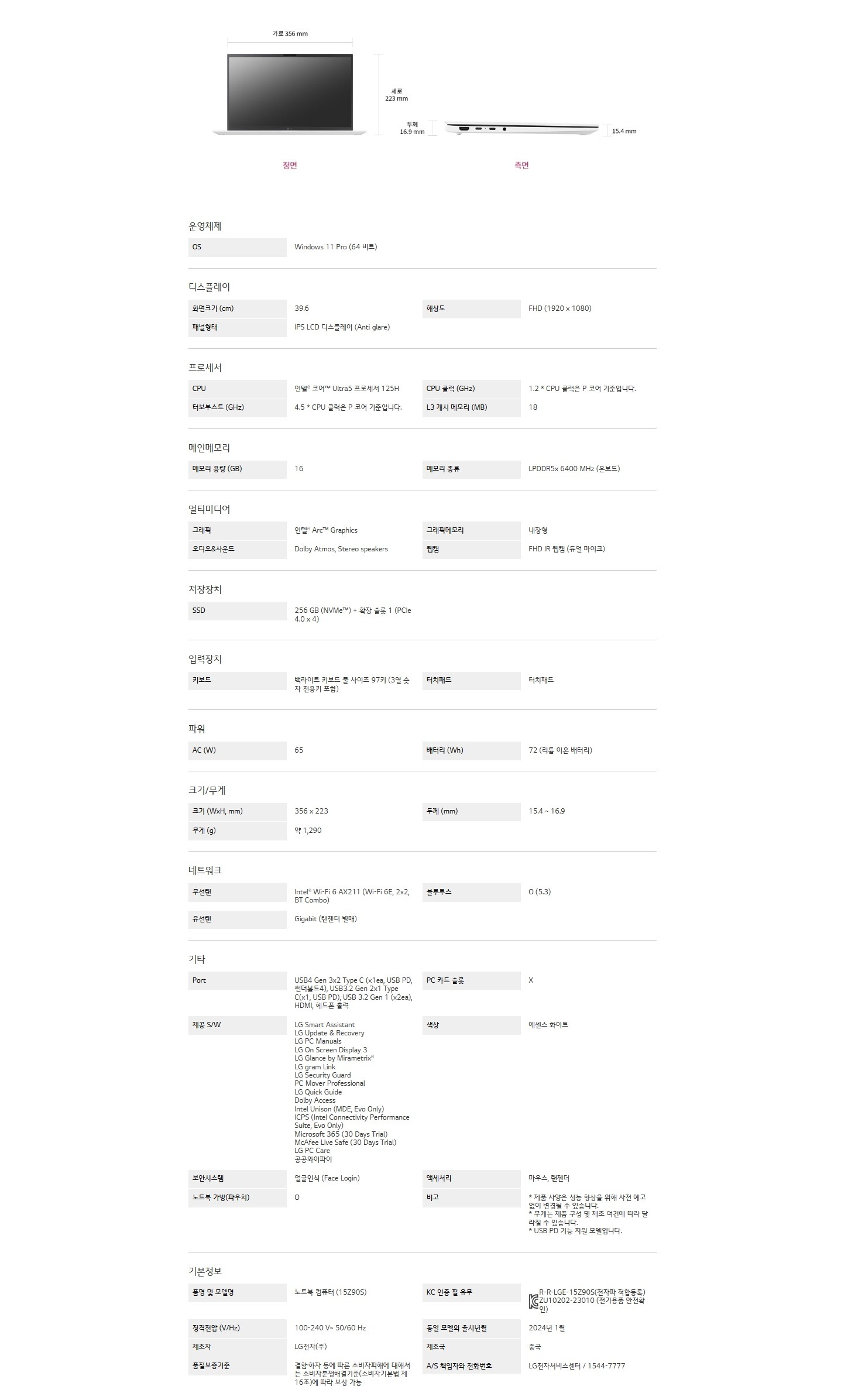 LG 그램 15.6인치 Ultra5 Win11 Pro 15Z90S-GP56ML